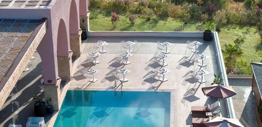Breakfast is served poolside each morning, while evening dining is à la carte with a Greek and Mediterranean influence, often accompanied by live music.