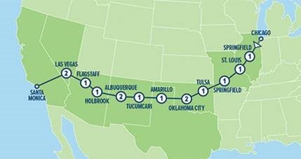 Chicago → Springfield → St. Louis → Tulsa → Oklahoma City → Amarillo → Tucumcari → Albuquerque → Holbrook → Flagstaff → Las Vegas → Santa Monica